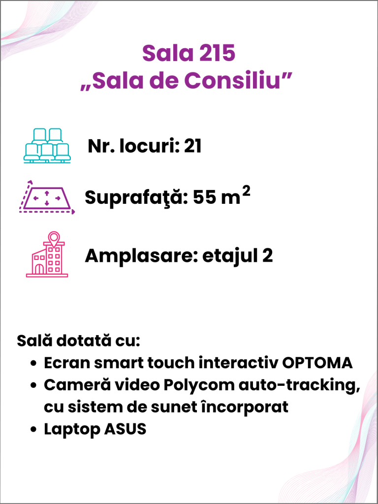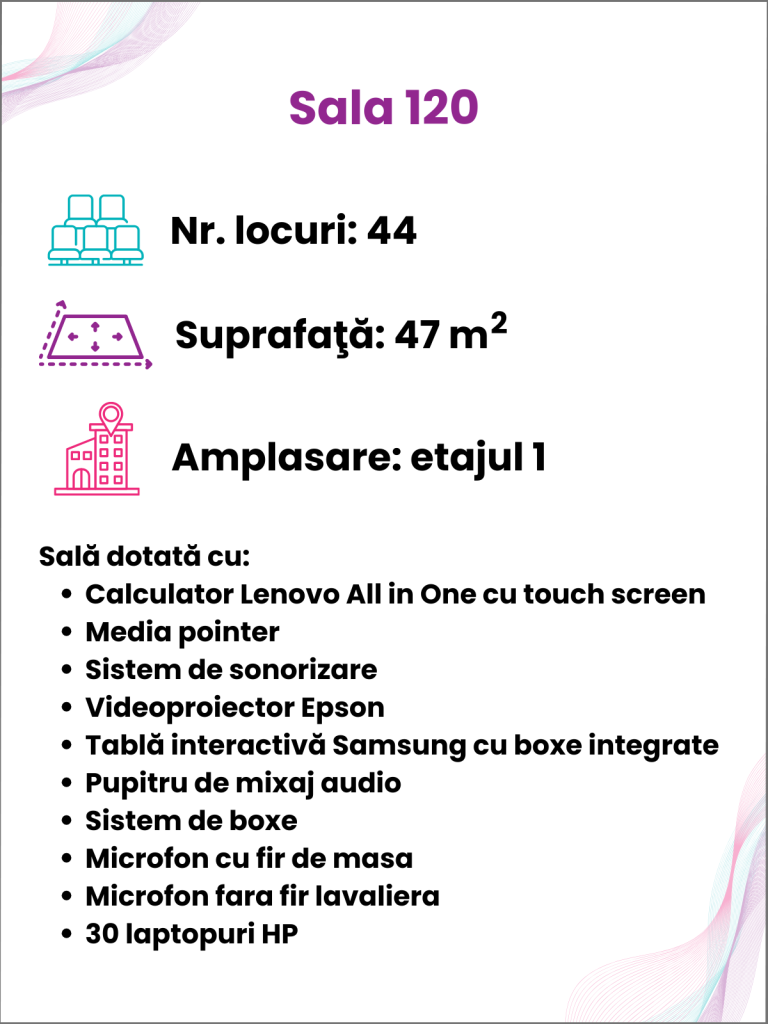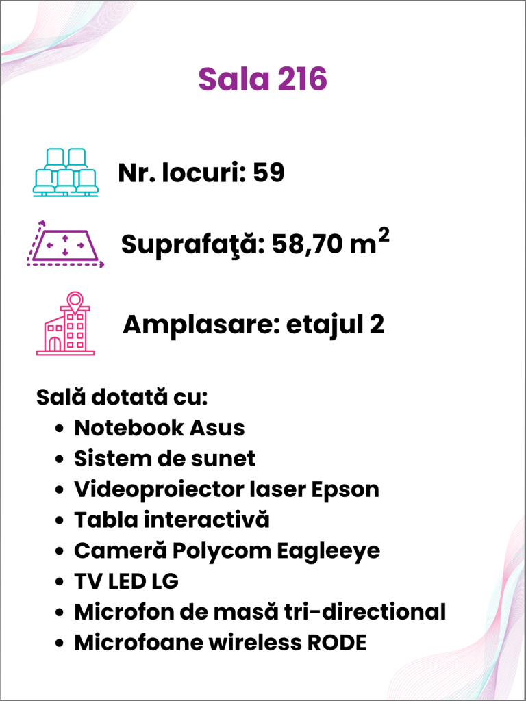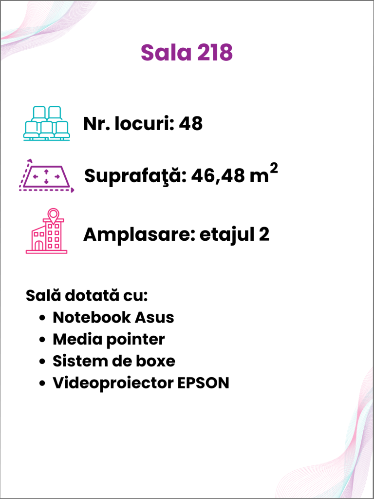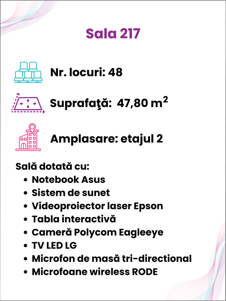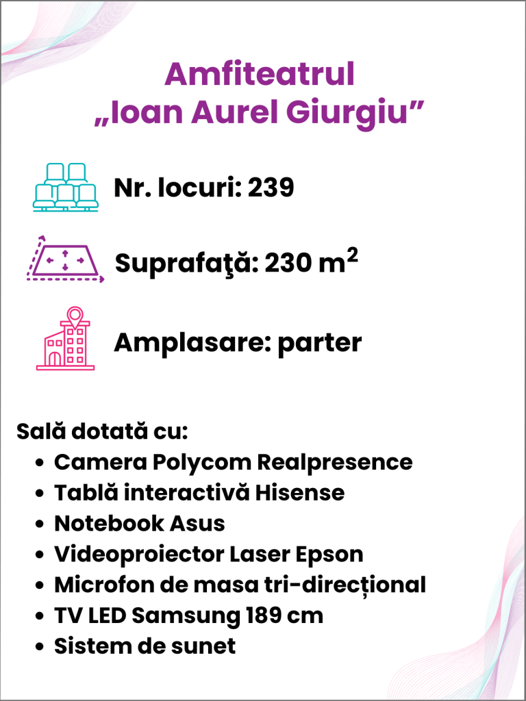 Prin această infrastructură modernă și dotări tehnologice avansate, Facultatea de Business își propune să ofere studenților un mediu de învățare adaptat cerințelor actuale ale pieței muncii și să susțină dezvoltarea competențelor necesare pentru o carieră de succes în domeniul afacerilor.