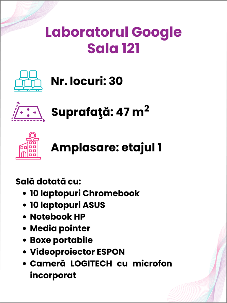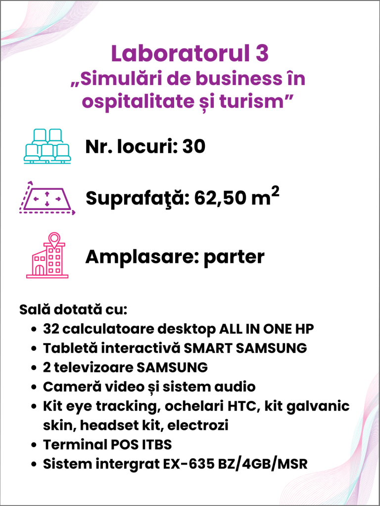 Laboratoarele sunt special concepute pentru a sprijini activitățile practice ale studenților. De exemplu, Laboratorul 3 – „Simulări de business în ospitalitate și turism” – este echipat cu 32 de calculatoare, simulatoare de afaceri (Ecosim Pro Account, Revas Simulation Games), software-uri specializate (pentru cercetarea comportamentului uman – iMotions Module – CORE; pentru analiza si vizualizarea datelor – Tableau Creator; pentru simulare și analiză – Oracle Crystal Ball Classroom Faculty Edition, pentru colectare automată de date – Helium Scraper). De asemenea, tot în cadrul acestui laborator se folosește o suită de dispozitive (soluții integrate) care facilitează colectarea datelor, prezentarea stimulilor și analiza datelor fiziologice și neuronale înregistrate cu ajutorul tehnologiilor neuroştiinţifice (EGG Headset Kit Brain Visions, Eye tracking bar, Wearable eye tracker Pupil Invisible, Kit Galvanic Skin Response).